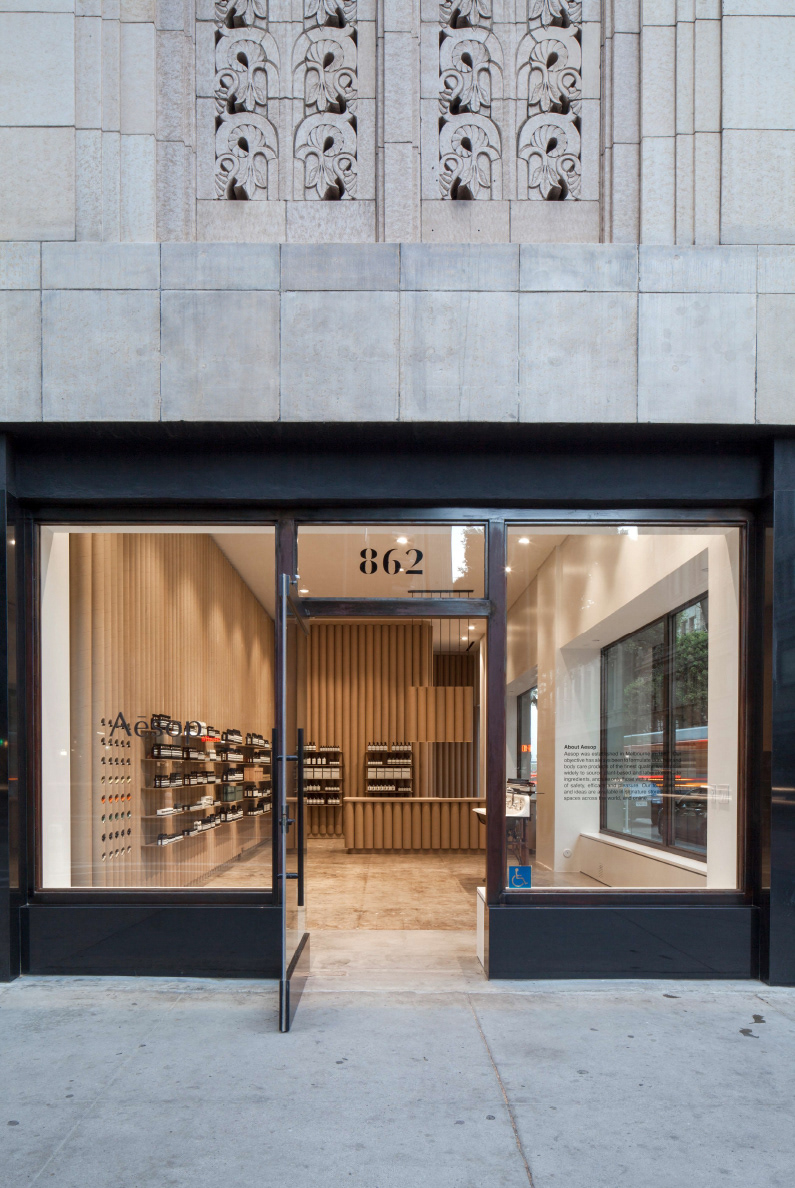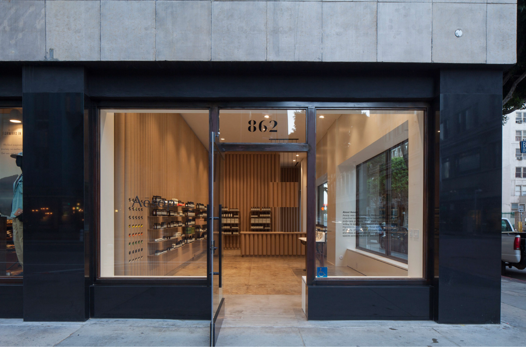 Nestled in the ground floor corner of the 1929 Eastern Columbia Building, Aesop Downtown, the company’s largest store to date, is situated in Los Angeles’ historic theatre district, at the edge of its Fashion District and adjacent to the famous Orpheum Theatre. Taking cue from the neighborhood culture and the empty bolts of fabric strewn about costume shops and fashion houses, the environment consists of 6-inch round cardboard tubes to create walls and furniture. This natural palette is warm and inviting, projecting a soft glow to the store’s interior and onto the street and sidewalk. Countertops are made of recycled paper, complimenting the cardboard tube wall finish. Product esting sinks are of a vintage style and floors are the natural concrete of the 1929 historic building. A long storefront captures a view of the busy street and projects a comfortable and unobtrusive space, inviting those outside to enter.